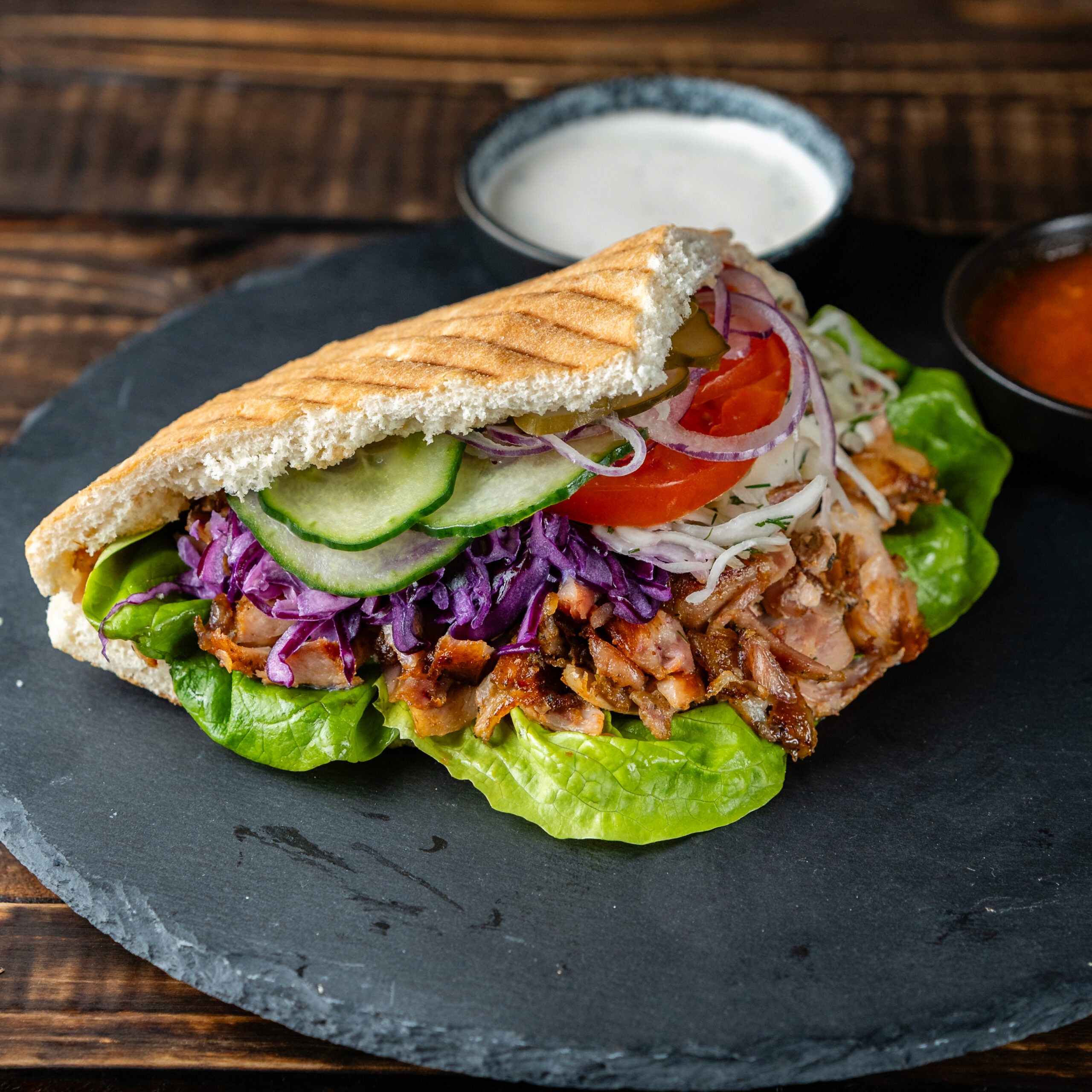 Bohatá porce šťavnatého telecího a kuřecího masa v dokřupava opečeném tureckém chlebu s čerstvým salátem, rajčaty, cibulí a naším domácím dresinkem.